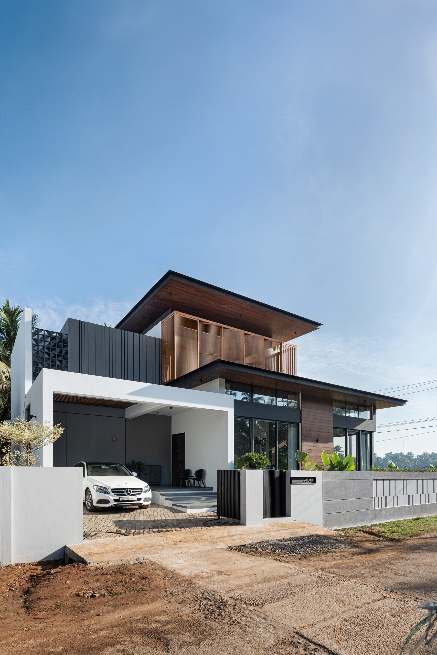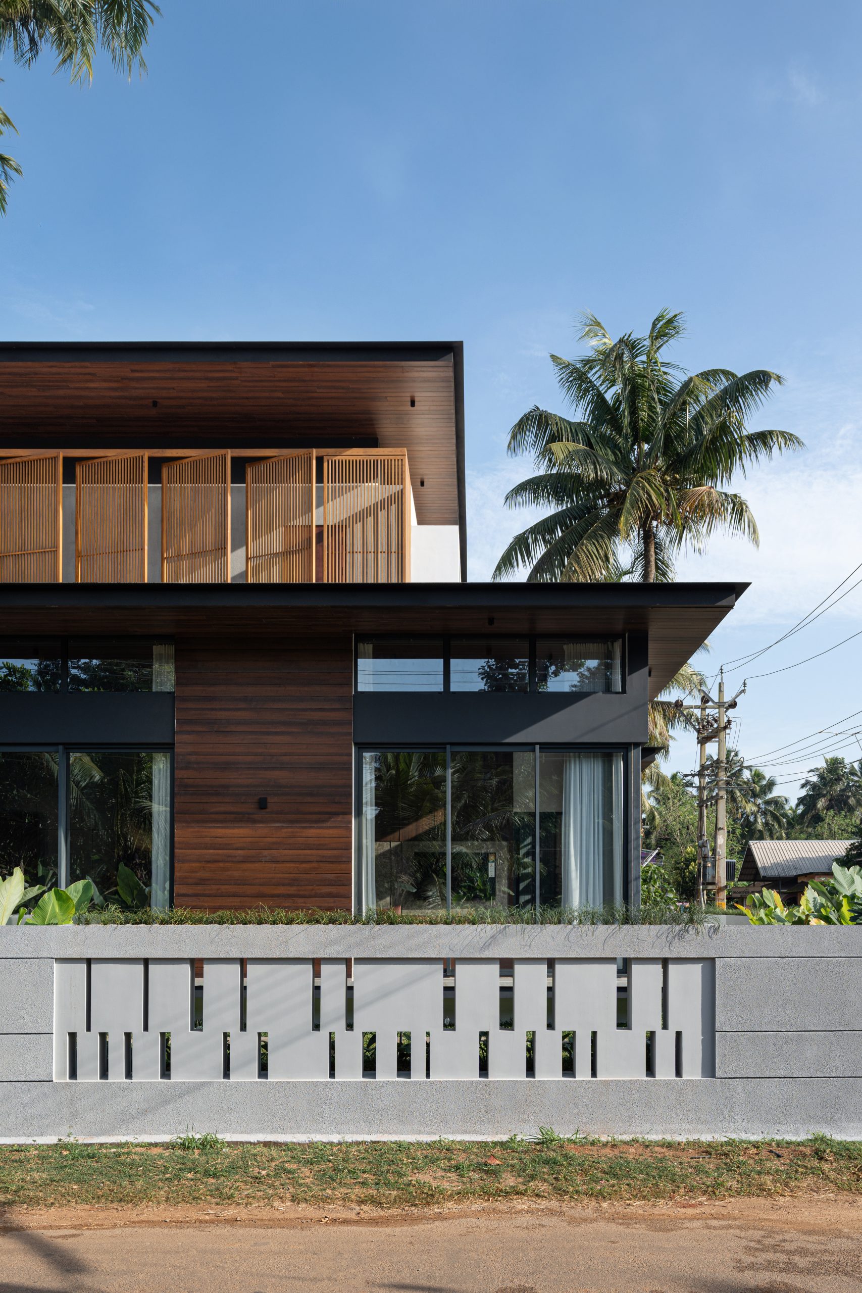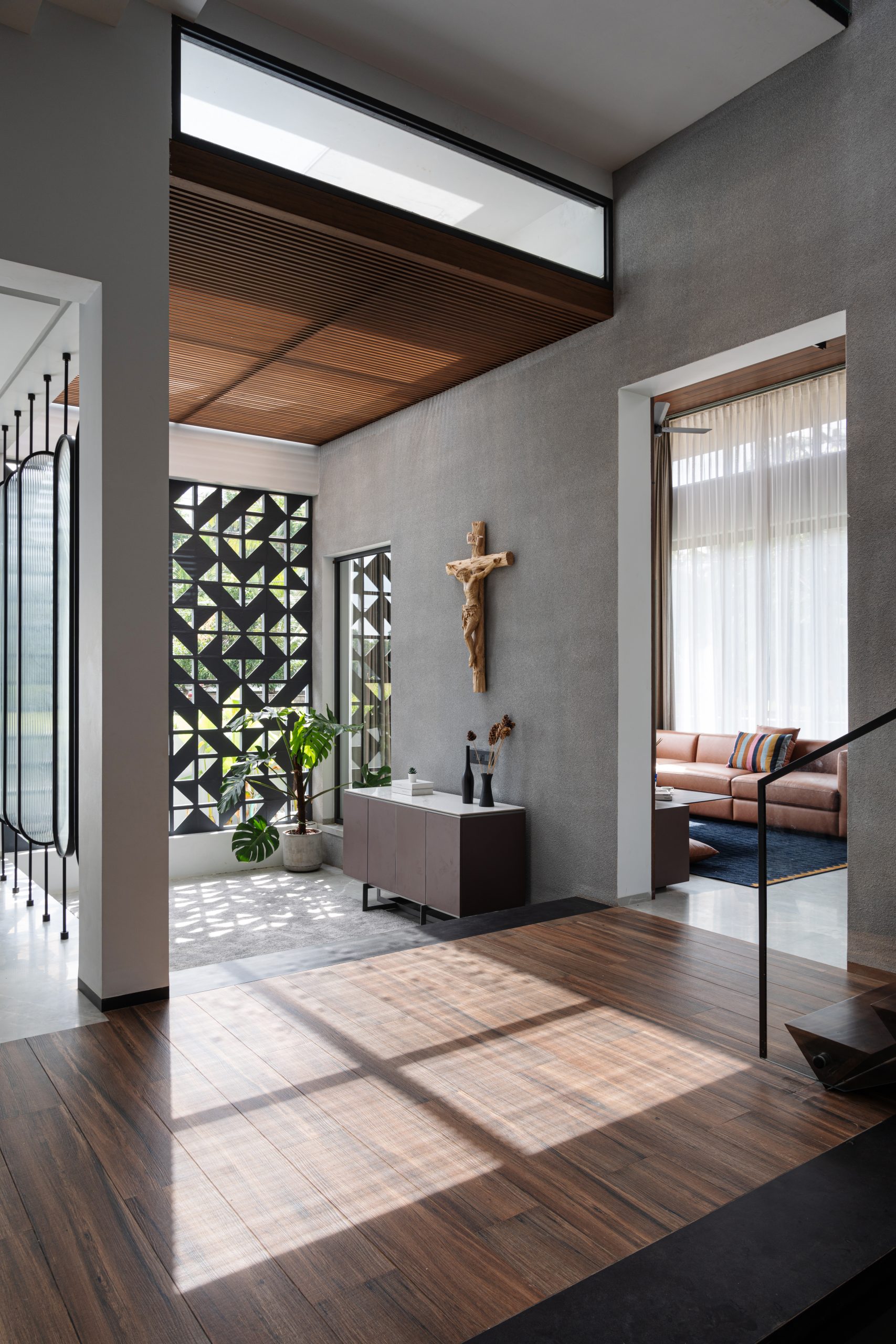 Elevating opulence to new heights, the Master bedroom unveils an open-to-sky courtyard, embraced by a tri-fold door that ushers the breathtaking vistas within. An en-suite sanctuary awaits, where the shower area unveils an enchanting connection with the sky, bestowing upon its occupant a much-needed respite in the lap of tranquility. The symphony of celestial alignment continues, as the prayer room and even the car porch unveil themselves to the expanse above, amplifying the residence’s aura of serenity. Strategically sculpted to shield against the sun’s unwavering gaze, the western facade stands tall. Across the home, double-glazed glass shields the interior from solar heat. On the upper floors, metal screens adorned with the embrace of wooden panels in the balcony rotate to open to beautiful vistas. Aloft, the roof extends its sheltering canopy, tailored harmoniously to the nuances of Kerala’s climatic temperament.