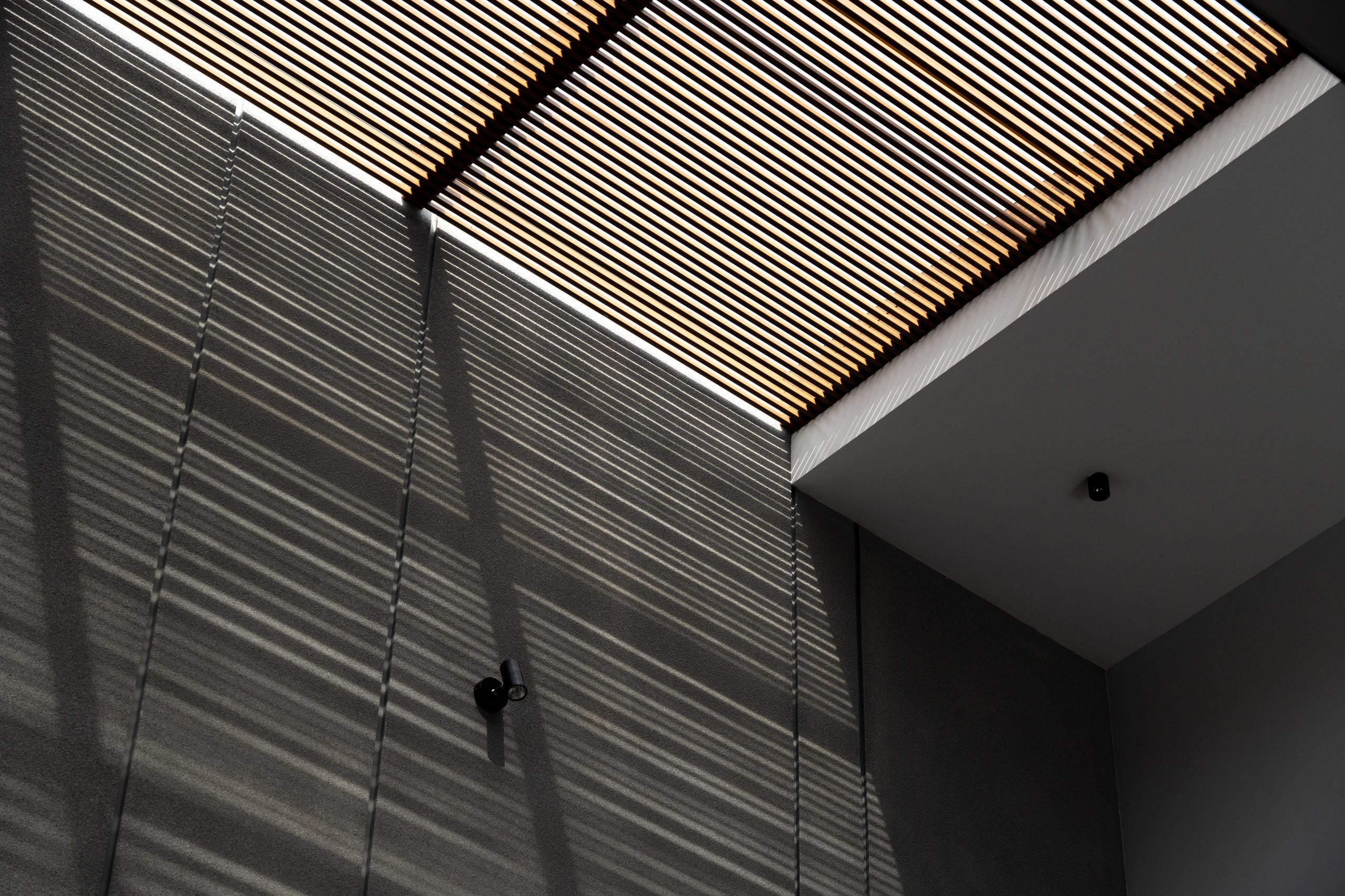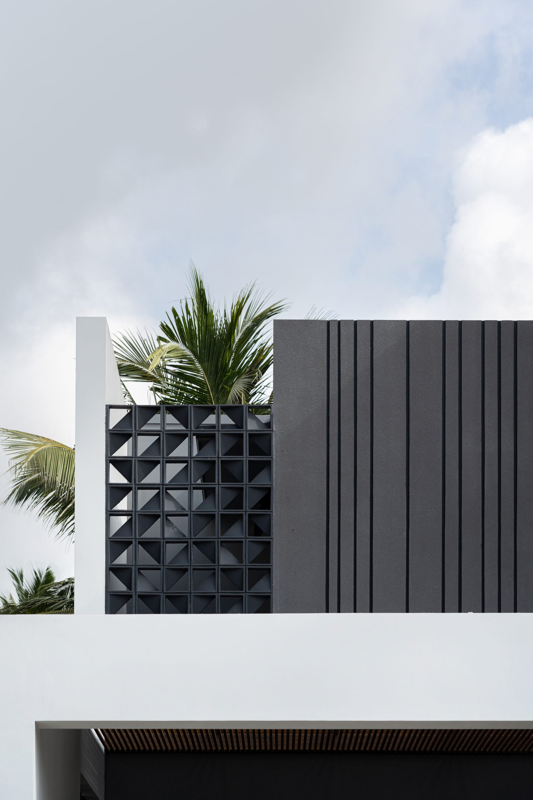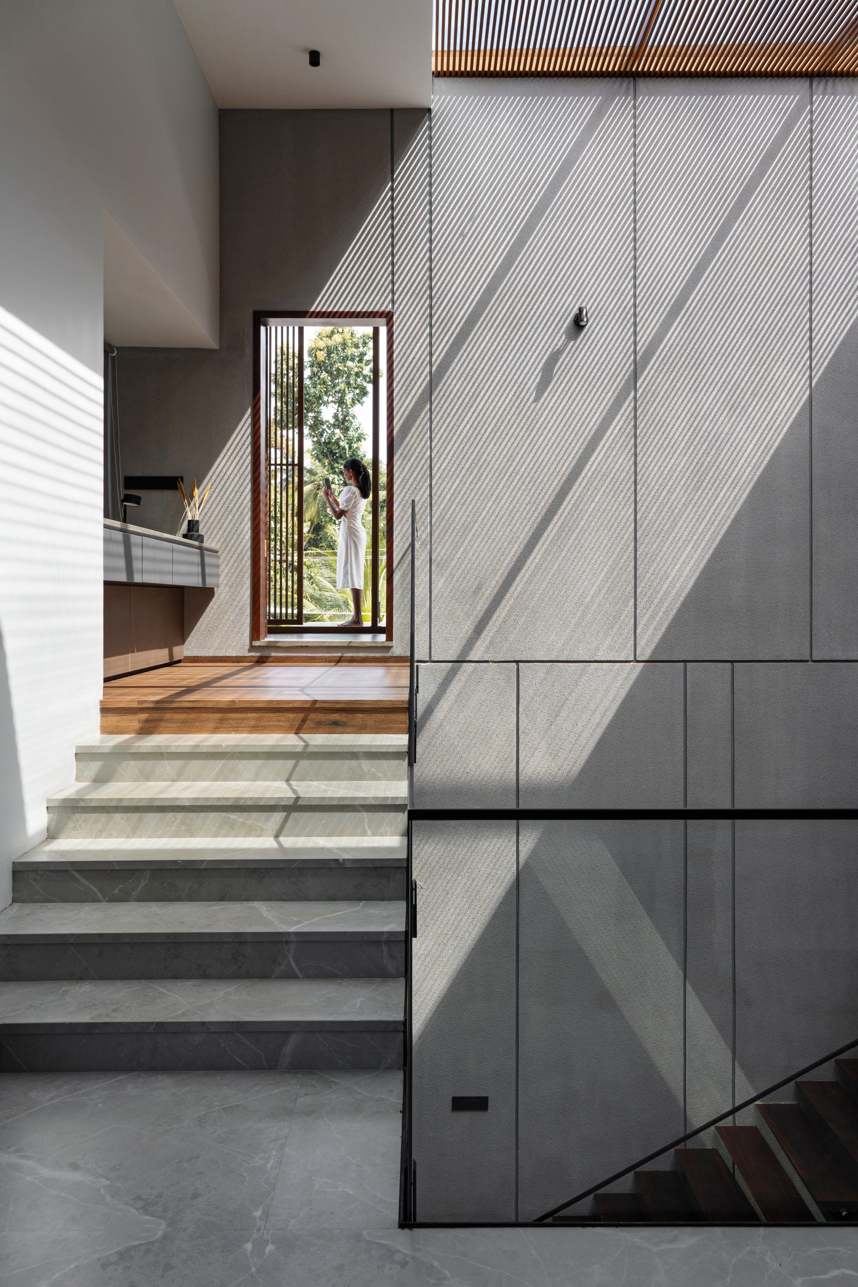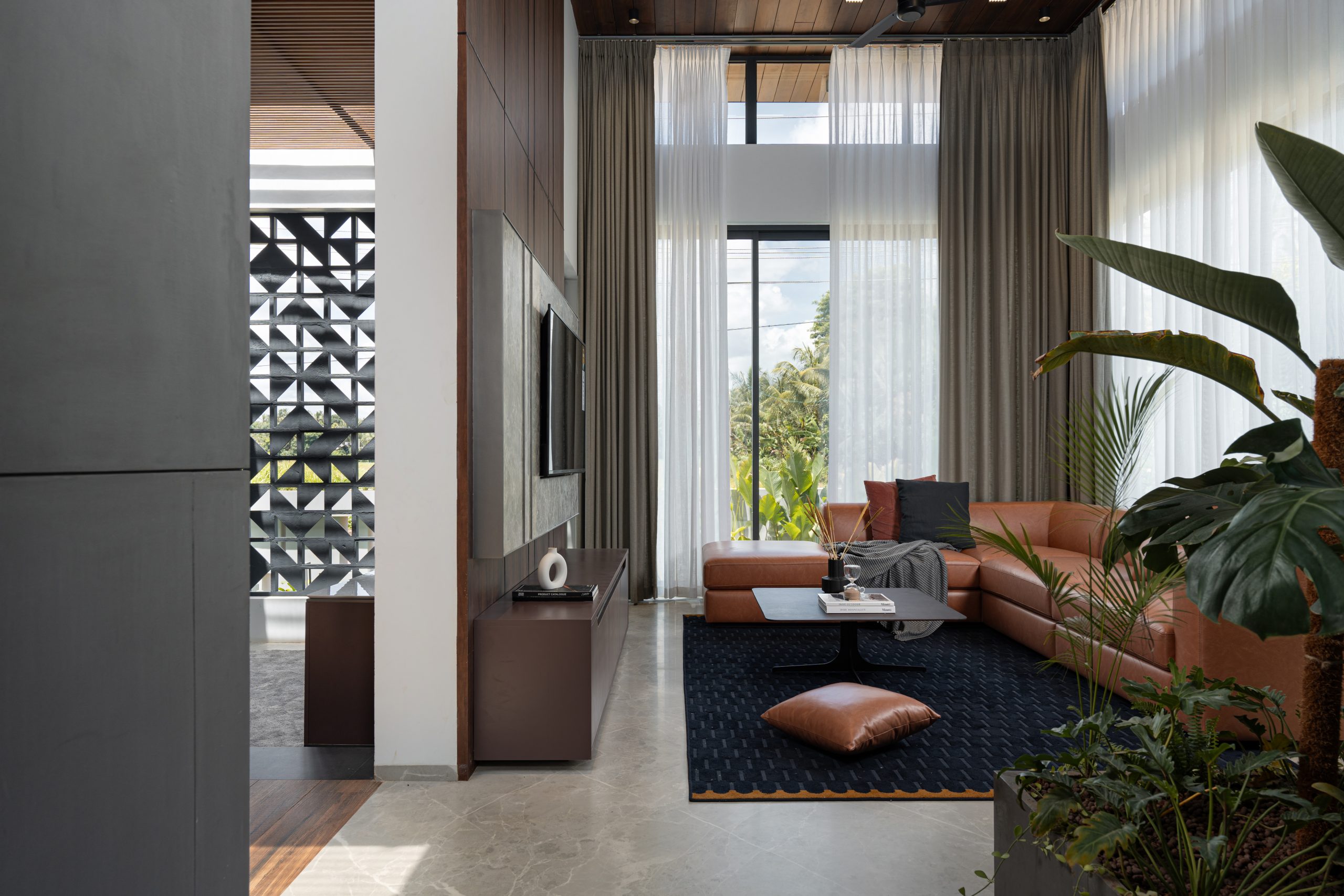 Elevating opulence to new heights, the Master bedroom unveils an open-to-sky courtyard, embraced by a tri-fold door that ushers the breathtaking vistas within. An en-suite sanctuary awaits, where the shower area unveils an enchanting connection with the sky, bestowing upon its occupant a much-needed respite in the lap of tranquility. The symphony of celestial alignment continues, as the prayer room and even the car porch unveil themselves to the expanse above, amplifying the residence’s aura of serenity. Strategically sculpted to shield against the sun’s unwavering gaze, the western facade stands tall. Across the home, double-glazed glass shields the interior from solar heat. On the upper floors, metal screens adorned with the embrace of wooden panels in the balcony rotate to open to beautiful vistas. Aloft, the roof extends its sheltering canopy, tailored harmoniously to the nuances of Kerala’s climatic temperament.