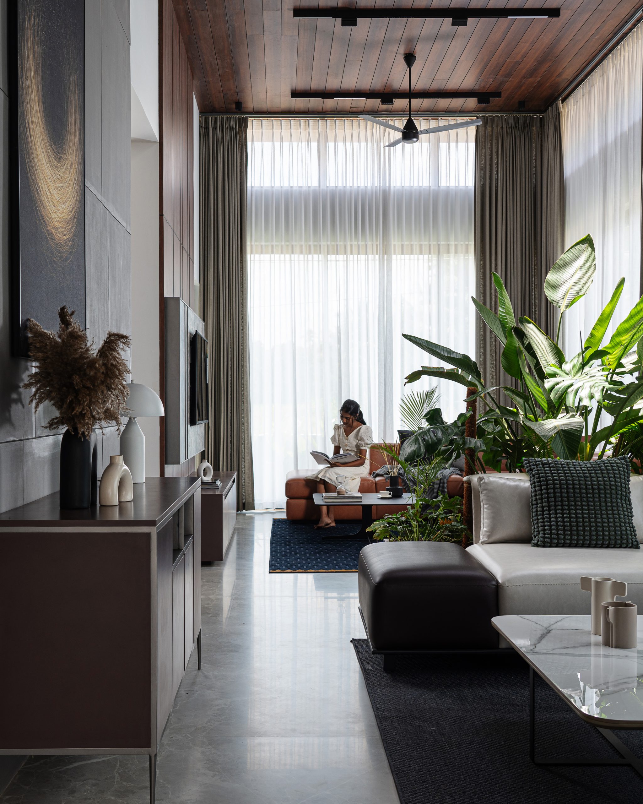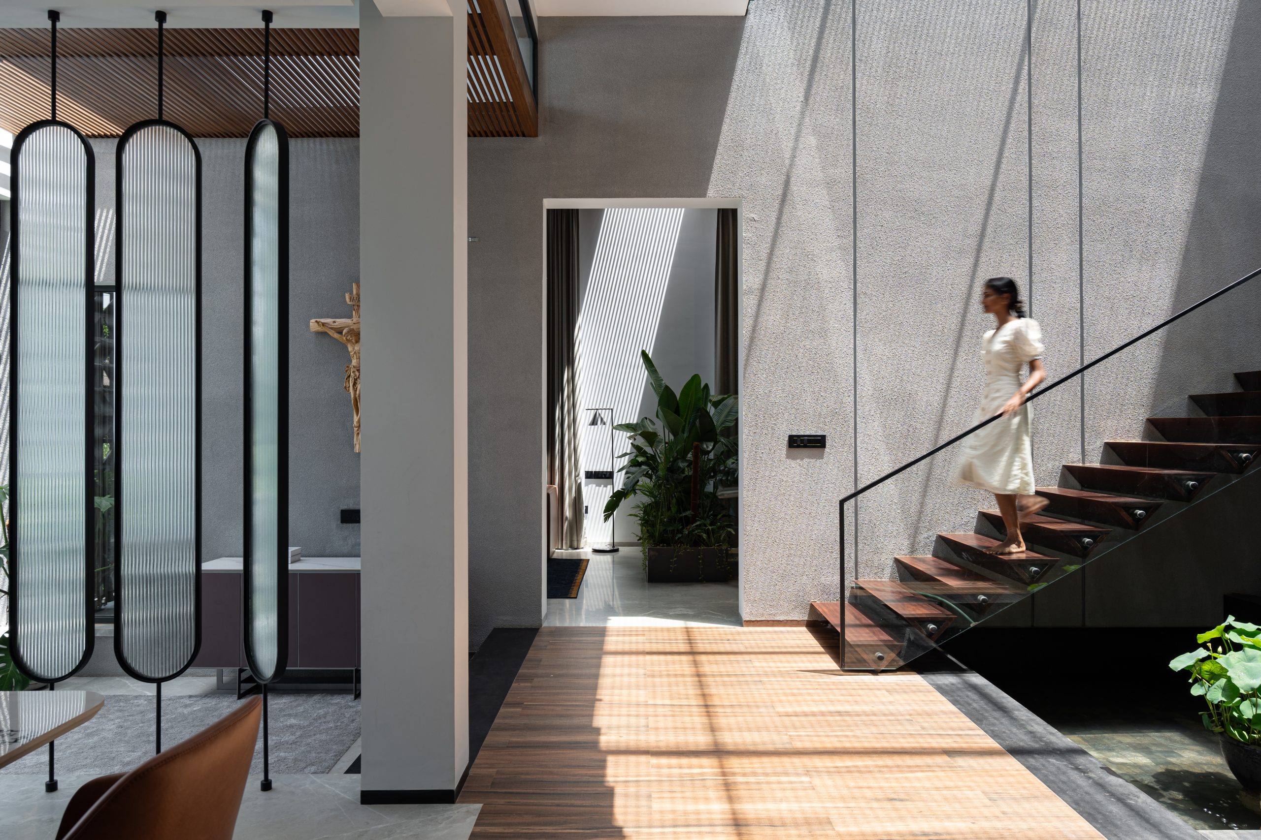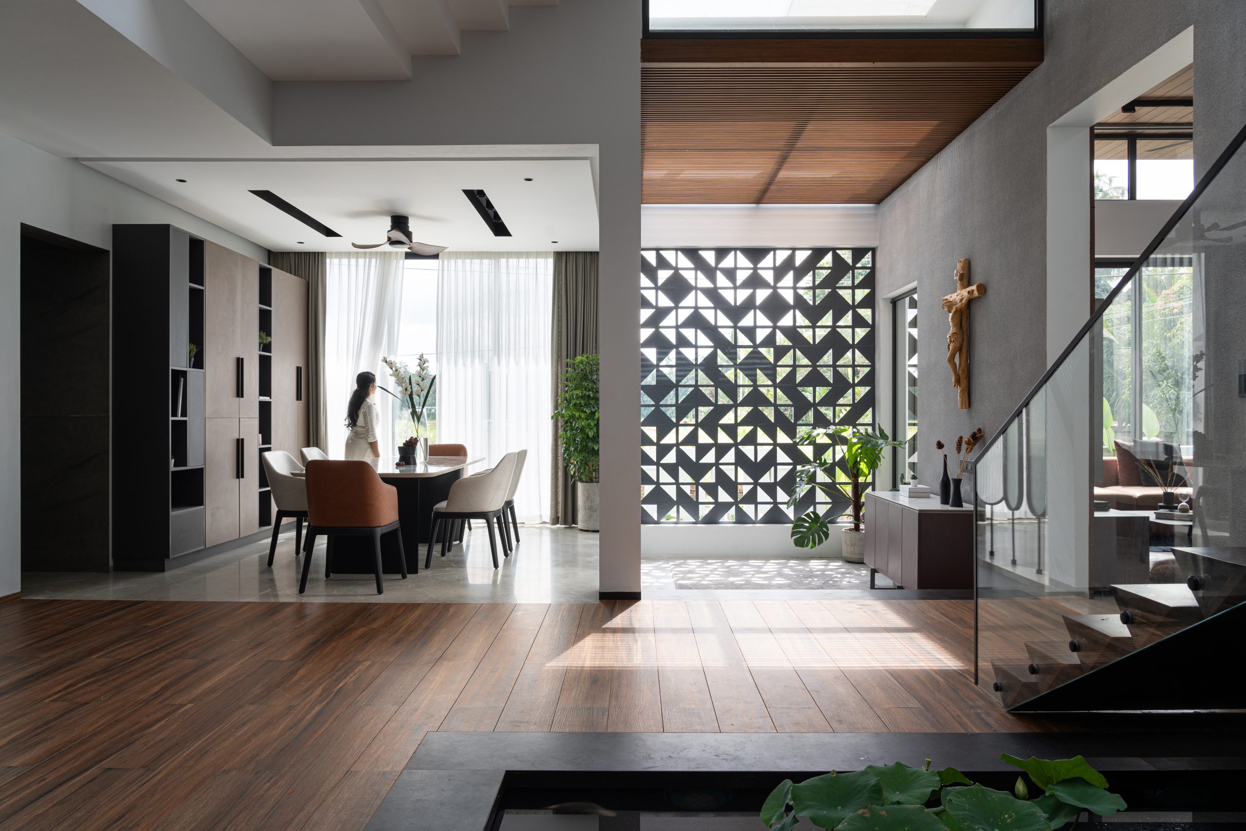 The planning of the Open Sky Residence itself is simple. The meticulous placement of water elements and verdant pockets transforms an open-plan canvas into a haven of secluded retreats. A striking embodiment of this ethos, the Birds of Paradise, not only pays homage to the concept of open-sky living but also acts as a visual partition, delineating the formal and informal living rooms. Upon entering, an aquatic sanctuary takes center stage, imparting a sense of serenity that embraces both mind and space, while also bestowing a natural cooling caress upon the interiors. Seamlessly intertwined, passive cooling mechanisms and the Venturi effect paint a portrait of sustainable living. All the while, portions of the residence are open to the sky and cater to inviting the splendor of the outdoors into its very core.