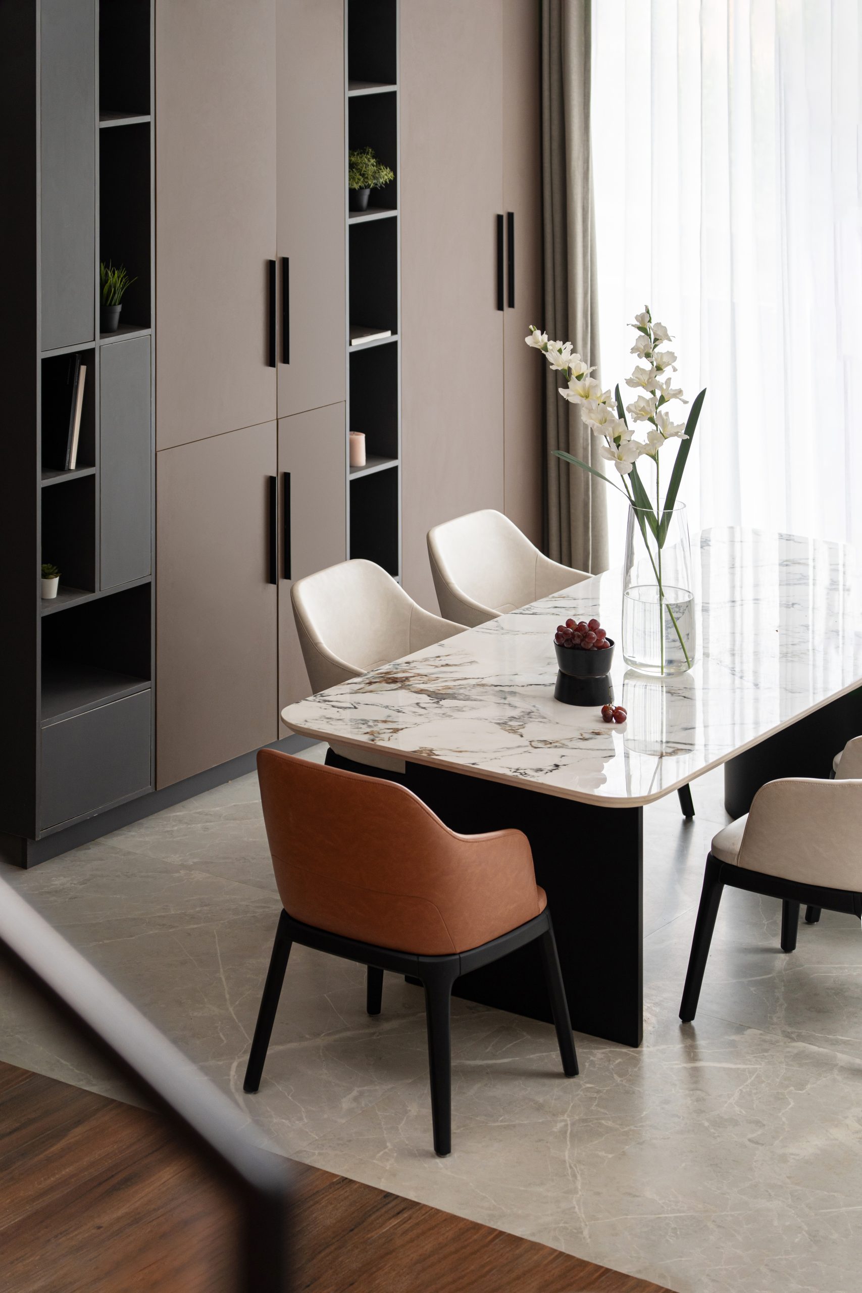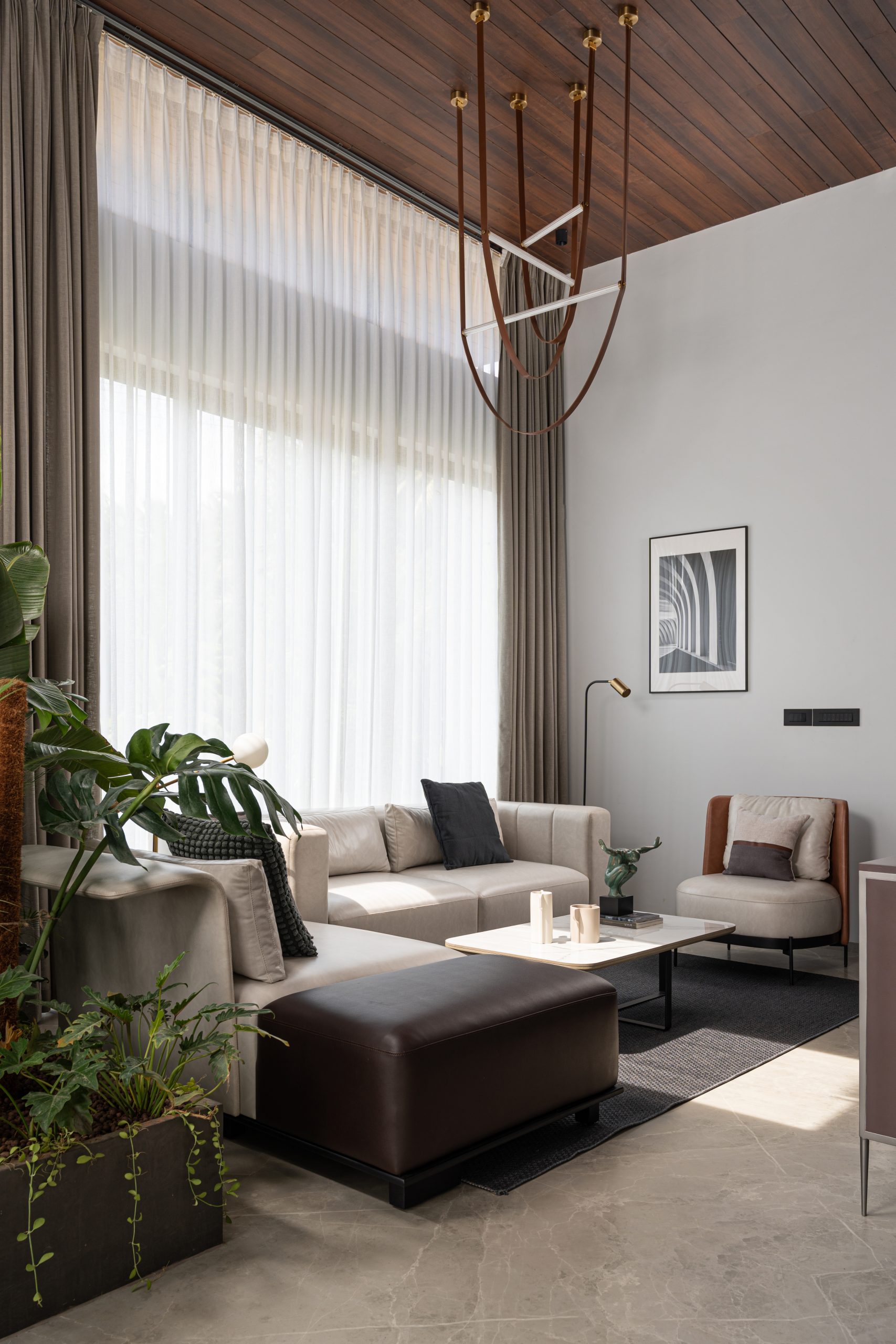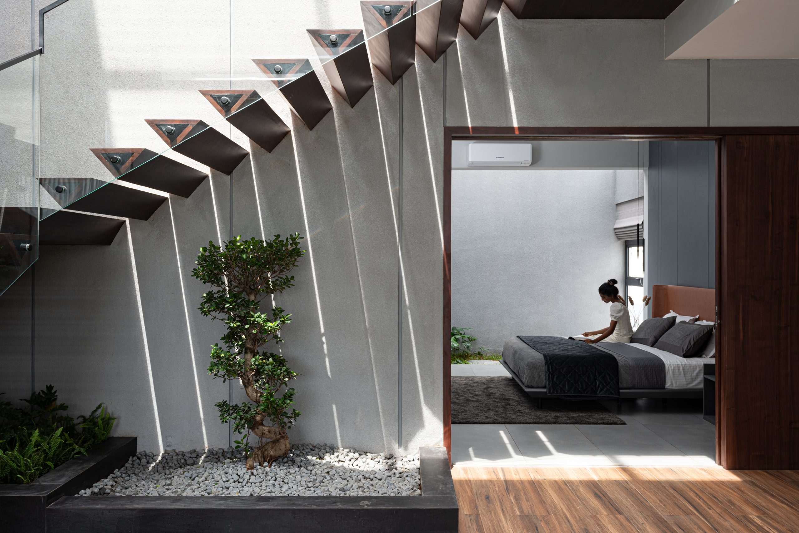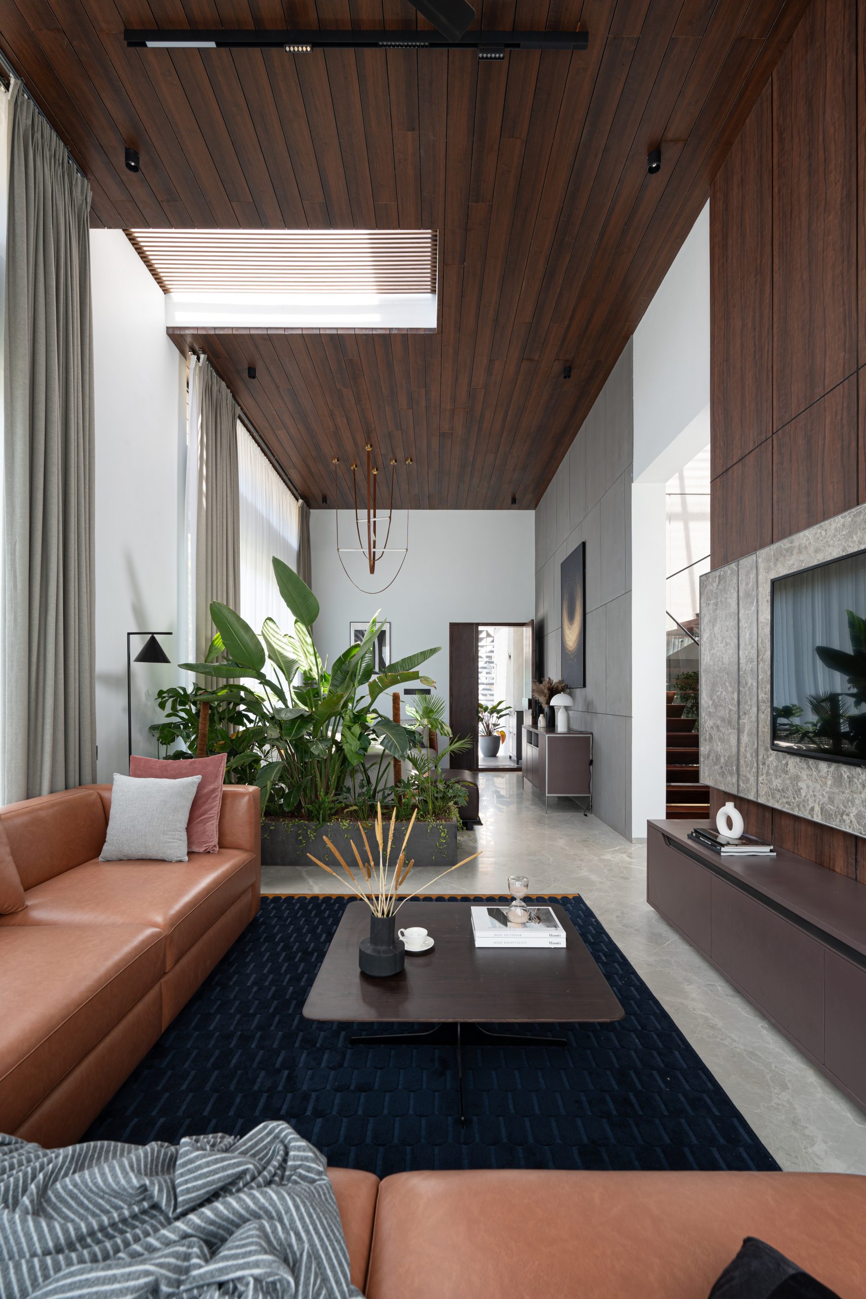 The planning of the Open Sky Residence itself is simple. The meticulous placement of water elements and verdant pockets transforms an open-plan canvas into a haven of secluded retreats. A striking embodiment of this ethos, the Birds of Paradise, not only pays homage to the concept of open-sky living but also acts as a visual partition, delineating the formal and informal living rooms. Upon entering, an aquatic sanctuary takes center stage, imparting a sense of serenity that embraces both mind and space, while also bestowing a natural cooling caress upon the interiors. Seamlessly intertwined, passive cooling mechanisms and the Venturi effect paint a portrait of sustainable living. All the while, portions of the residence are open to the sky and cater to inviting the splendor of the outdoors into its very core.